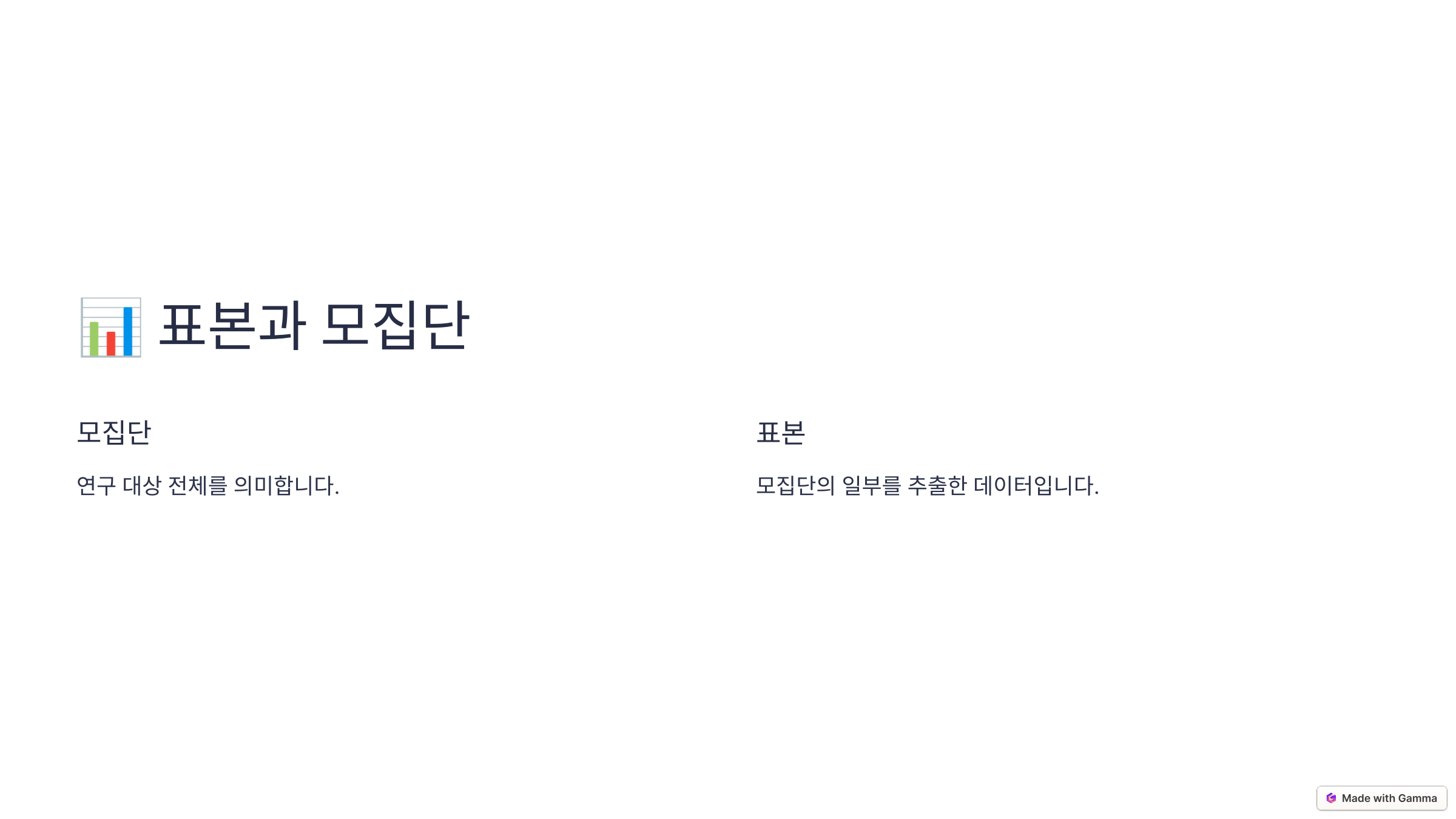 - 모집단(Population): 연구 대상 전체를 의미합니다.